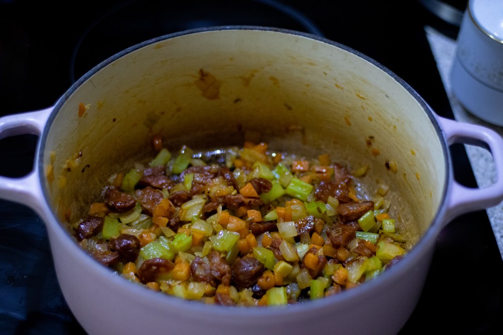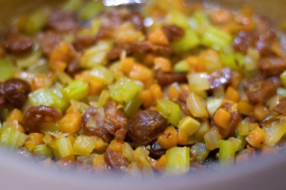For the stew I diced the chorizo, onion, carrot, celery small and left the sweet potato slightly bigger for some texture. Start by frying the chorizo with a tablespoon of olive oil in the pot, get a small bit of colour on it. Now add the vegetables except the sweet potato and fry for 2 minutes. Add the smoked paprika and fry for a further minute. Then add the stock, tomatoes, and sweet potatoes and bring to a simmer.