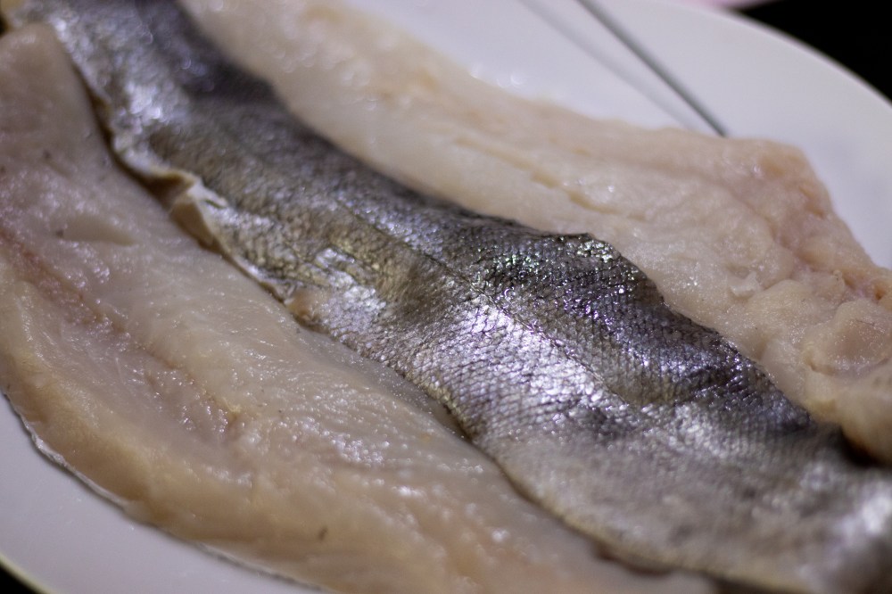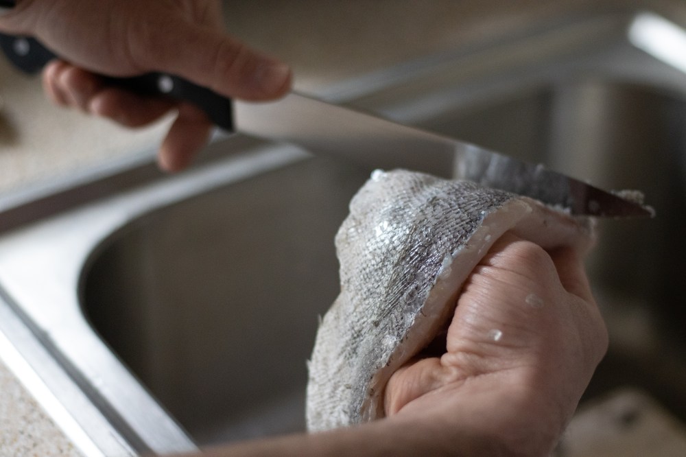 Meanwhile descale your hake by running the edge of a knife from the tail end towards the top and remove any bones that might be in the flesh. You could ask your fishmonger to do this for you, but I always like to check that it is clean. Turn your oven on to 180’C.