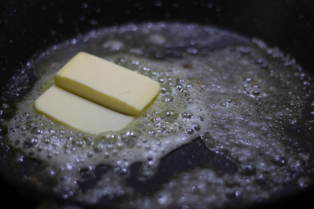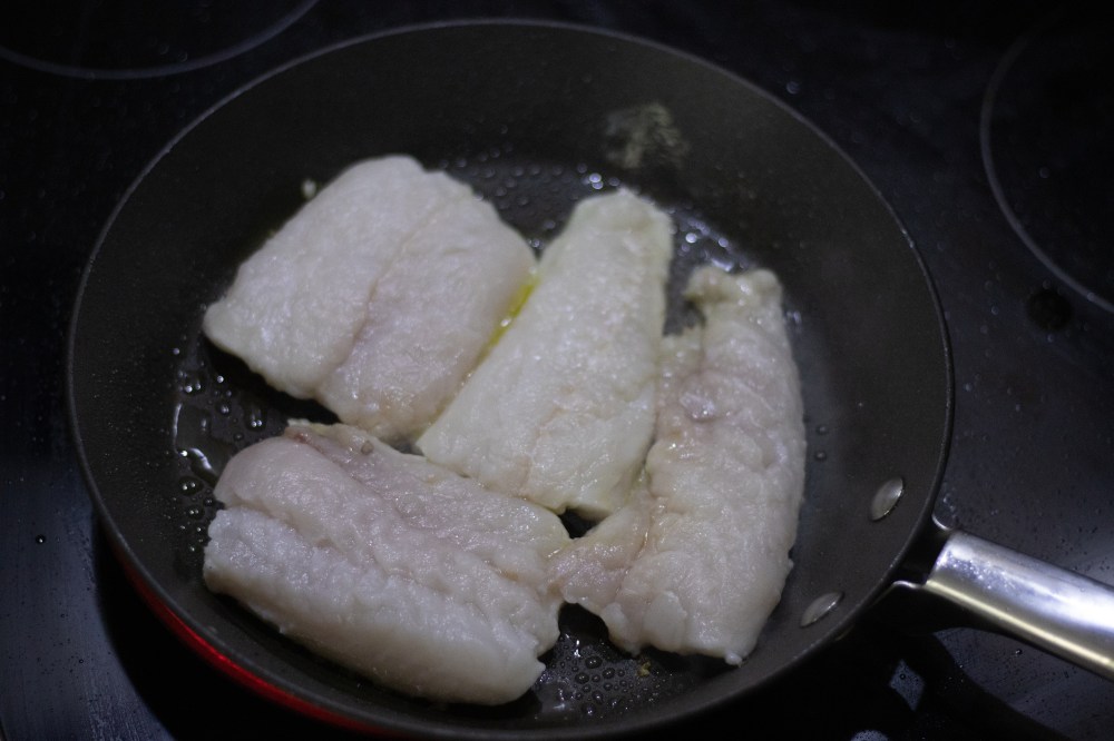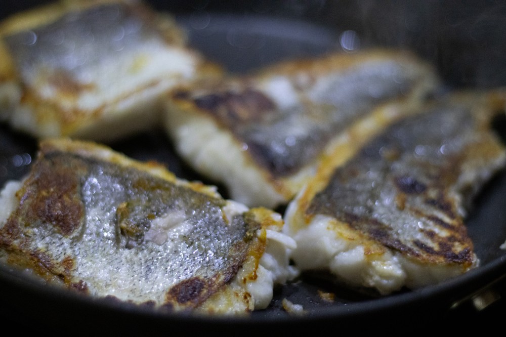 Pat the fish dry on a piece of kitchen paper and fry in a hot pan to crisp up the skin, then place on an oven tray lined with grease proof paper. I did this in two batches and then deglazed the pan with some butter to pour over the hake.